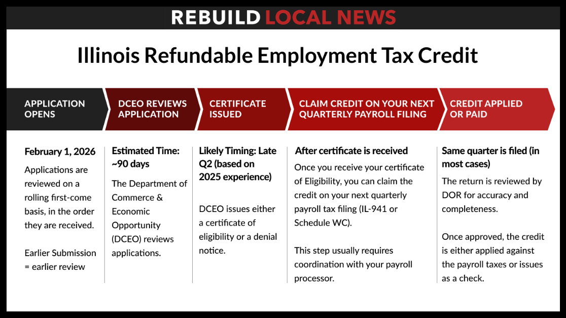 - The Illinois Department of Commerce & Economic Opportunity (DCEO) hosts the program and maintains the digital application. You can start the application online through the DCEO portal. The application window will open on February 1, 2026.